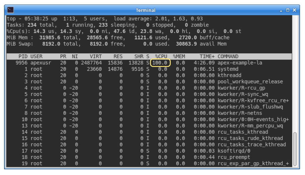 As noted earlier, spinning comes with the drawback of high CPU consumption. This is illustrated in the following screenshot, which shows system load while Apex was running in spinning mode. The %CPU column shows the engine now fully consumes a logical CPU, remaining near 100% at all times.