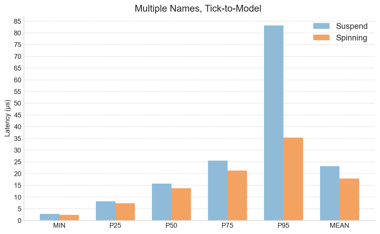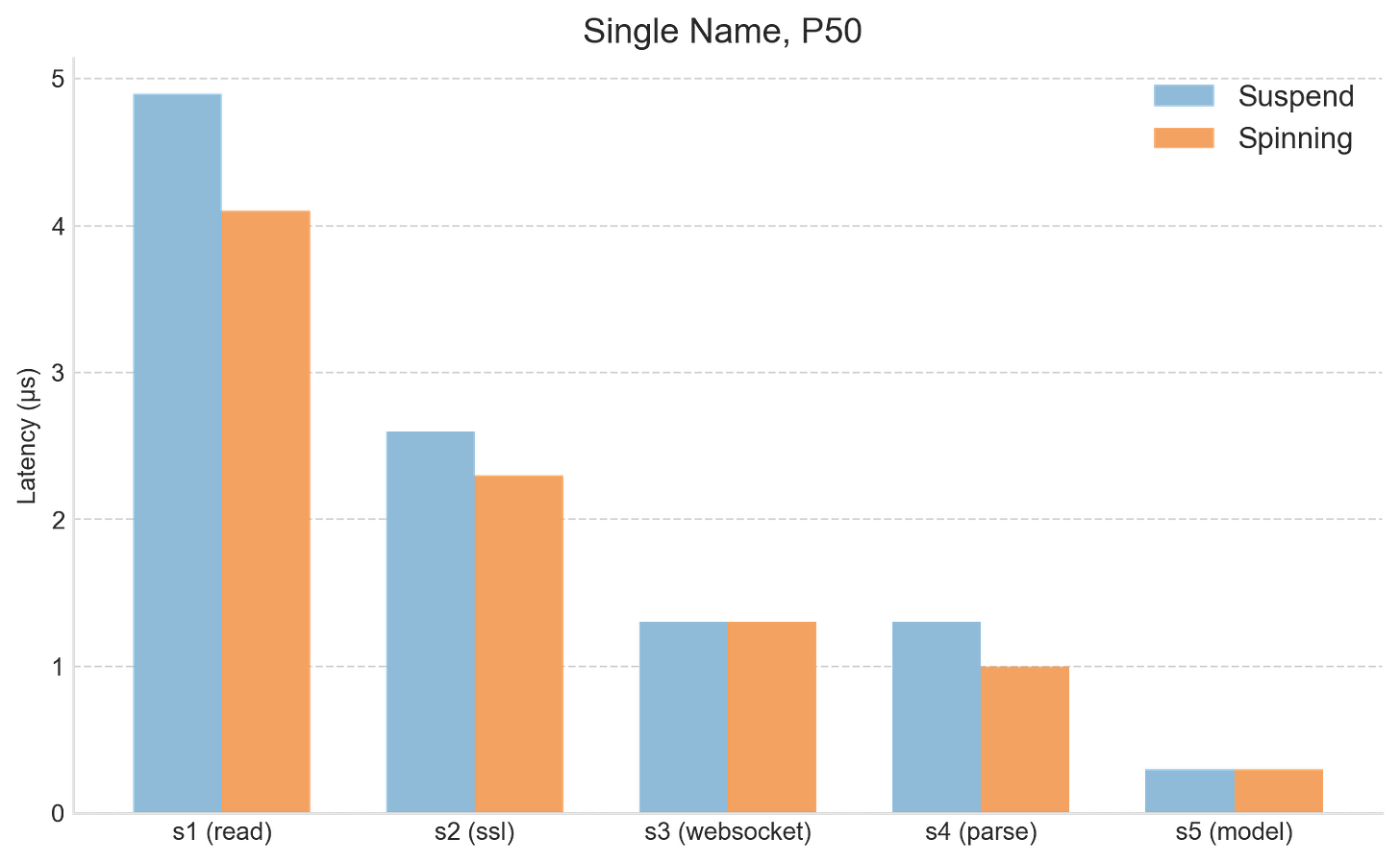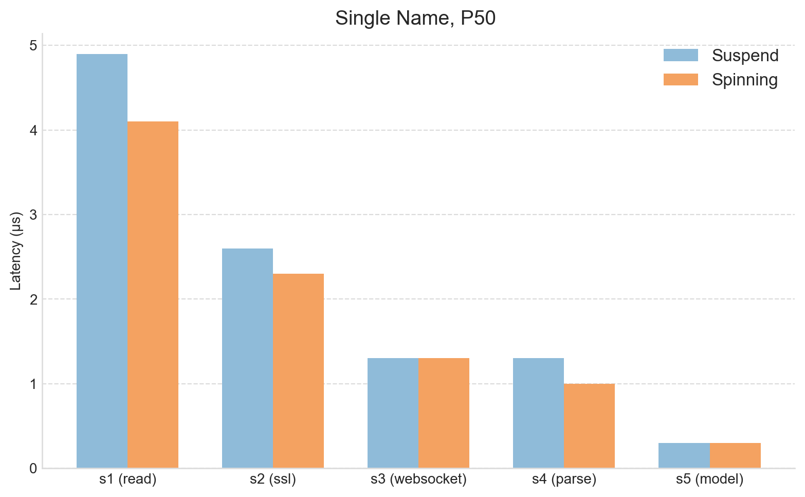 To investigate this, the milestone latencies for the single-instrument P50 results are compared in the following chart. We can seen that the reduction is concentrated almost entirely at the socket IO stage. This is expected, because it’s precisely during this stage where a thread would otherwise be suspended and later resumed, incurring wake-up latency.