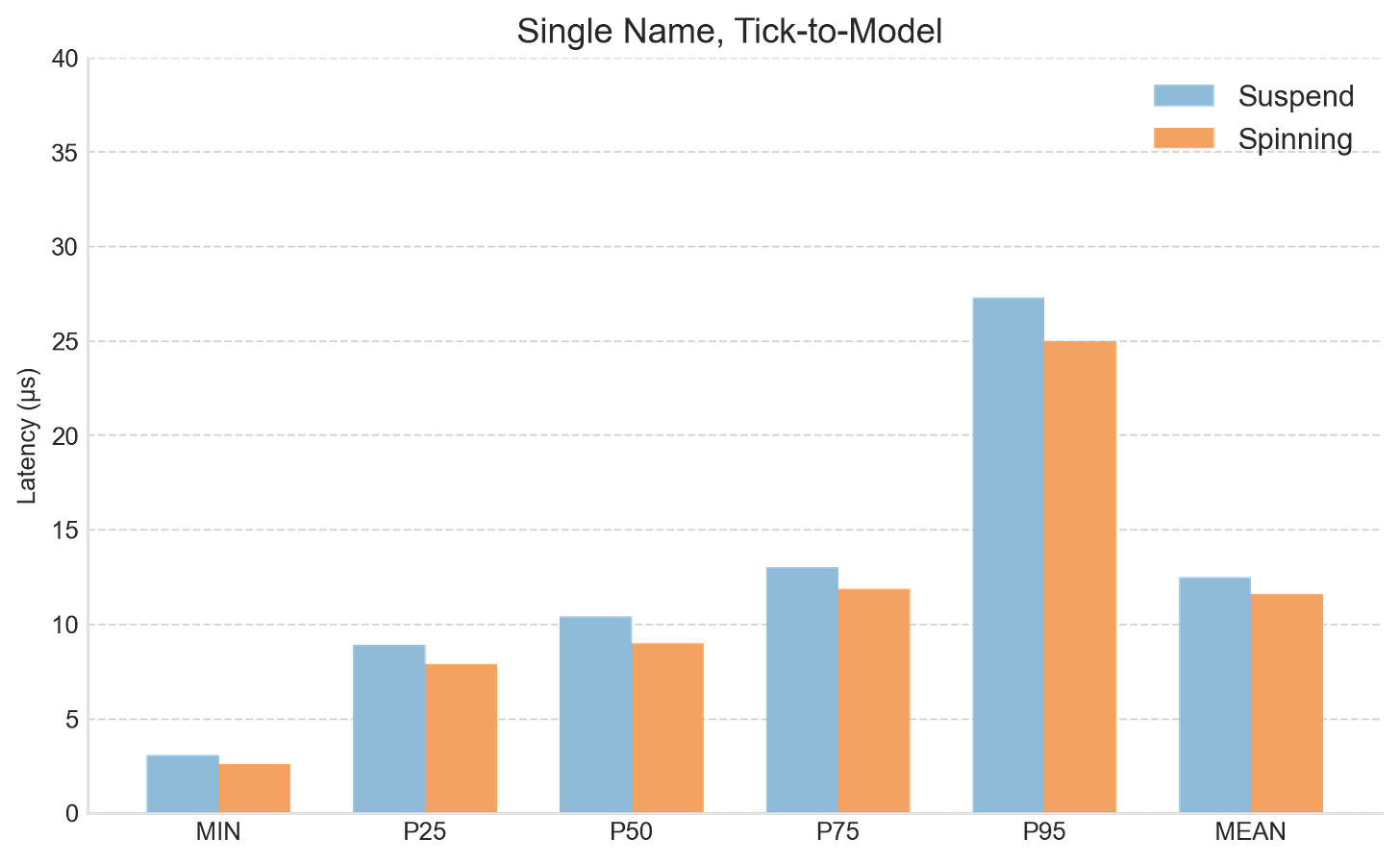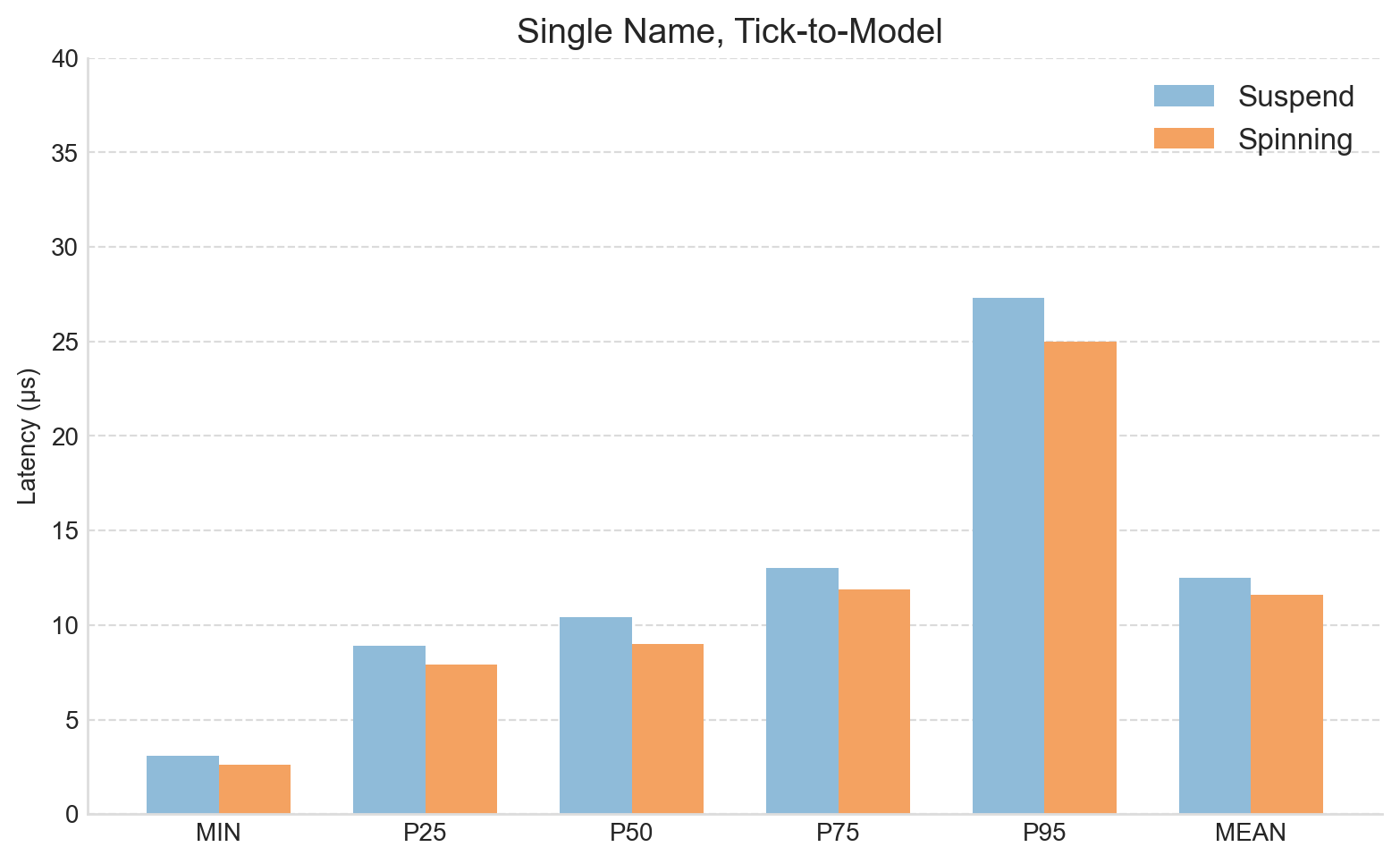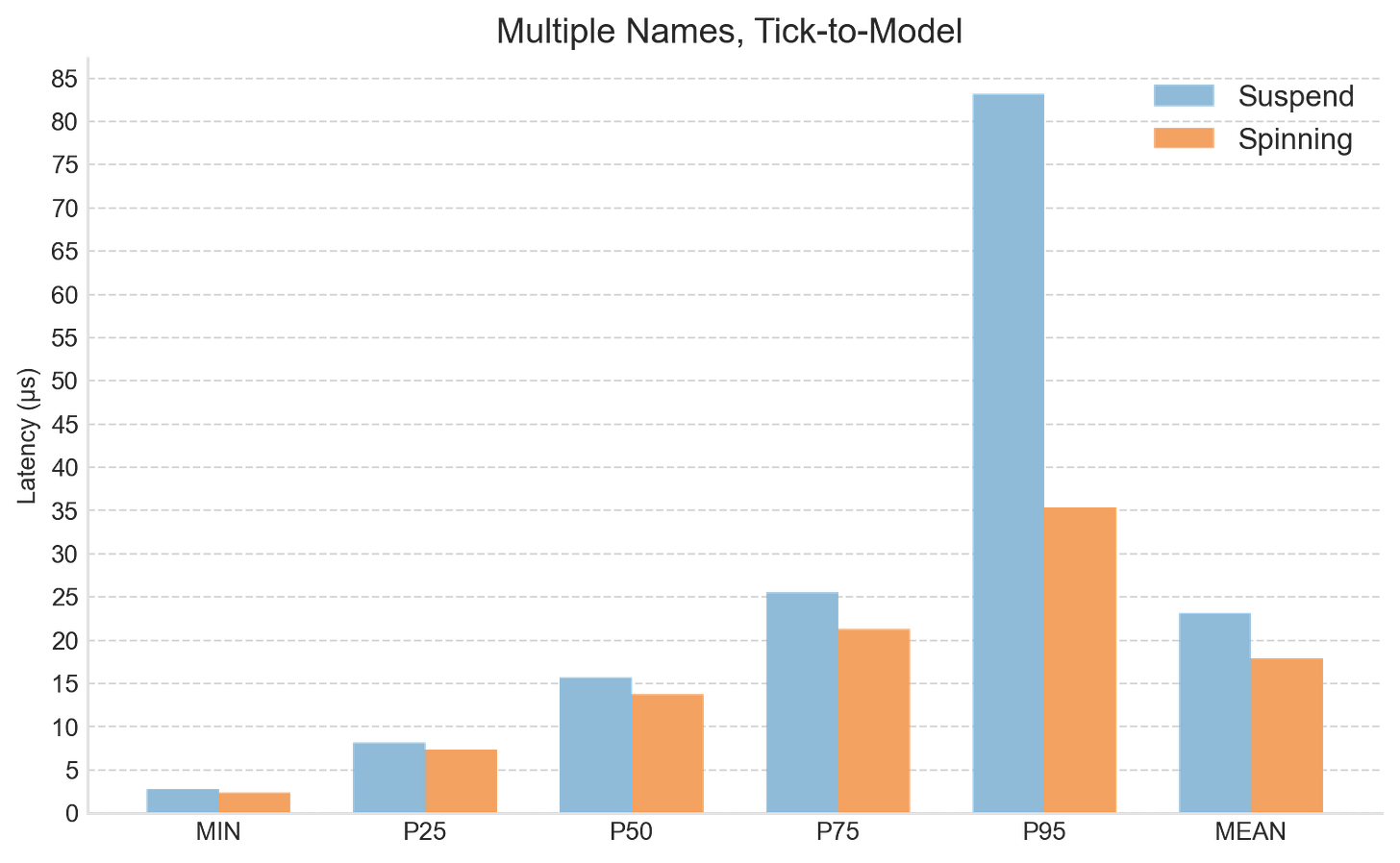 To examine how thread spinning affects latency, Apex was run in both spinning and non-spinning modes, and the total tick-to-model latency was measured and compared. As in previous experiments, the test system was a 3.40 GHz Intel Core i7, with C-states and P-states configured for minimum latency (as described earlier in this series, here).