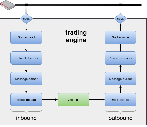The next figure shows a fairly typical sequence of events for a tick based trading engine (in this case the engine has direct links to the exchange). An inbound flow sees market data packets arrive off the network, entering into the application by successive socket reads. These raw network bytes might then require framing/security protocol decoding (such as TLS & WebSocket). Then we have actual raw exchange data, which is then parsed to transform it into the native data structures of the application. Finally an internal model state is updated; in the case of a market data tick (such as a trade, or order book), a suitable market object is identified and updated appropriately.