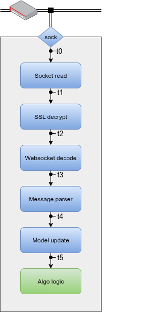 By breaking down the flow into these sections, we can try to insert timestamp collection code at each step. For example, we can capture the time when data came off the socket, and the time when data was written to the socket, and from there we can determine overall internal tick-to-trade latency.