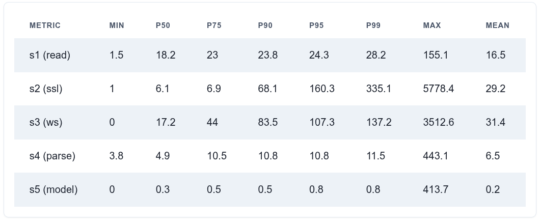 This breakdown allows for latency attribution to distinct stages: transport, security, protocol, parsing, and model update. With these granular measurements, we not only observe total inbound latency but can also identify which specific operations dominate processing time. That insight is critical for guiding later optimisation efforts.