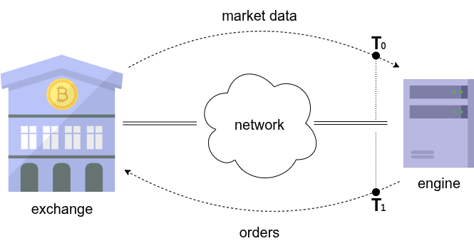 A natural place to start at is with the full round-trip latency. This is illustrated in the figure below: the engine receives a market data update — for example, a trade print or a level-1 quote change — and responds by generating and transmitting an order to the exchange. This complete “tick-to-trade” chain treats the trading engine as a black box, ignoring its internal structure. If we can capture the time at which market data enters the server and the time at which the order leaves the server, we obtain the full tick-to-trade response latency, T1 - T0.